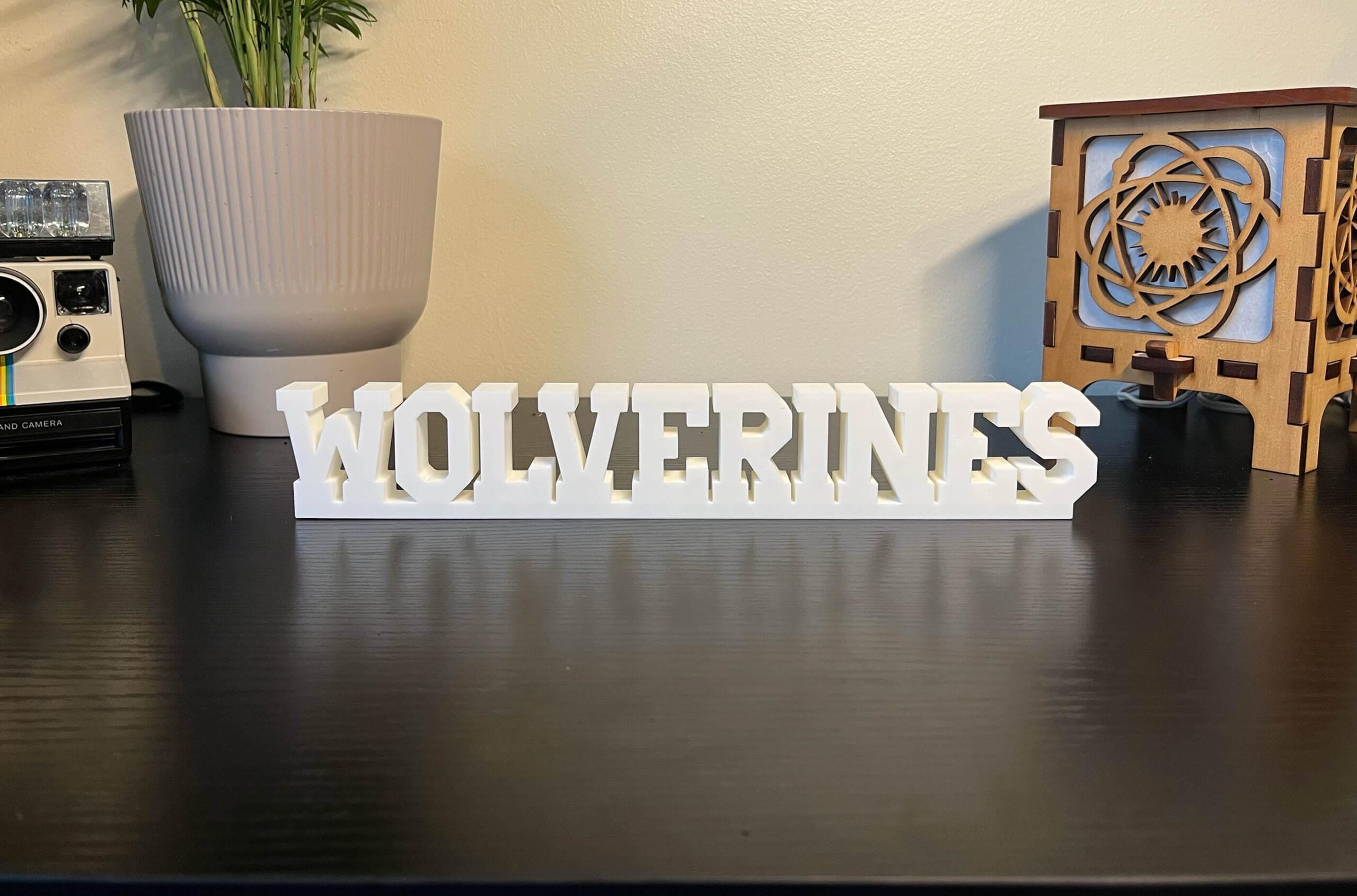“Wolverines” text that is 3D printed using PLA filament. Designed and printed in the U.S.A.