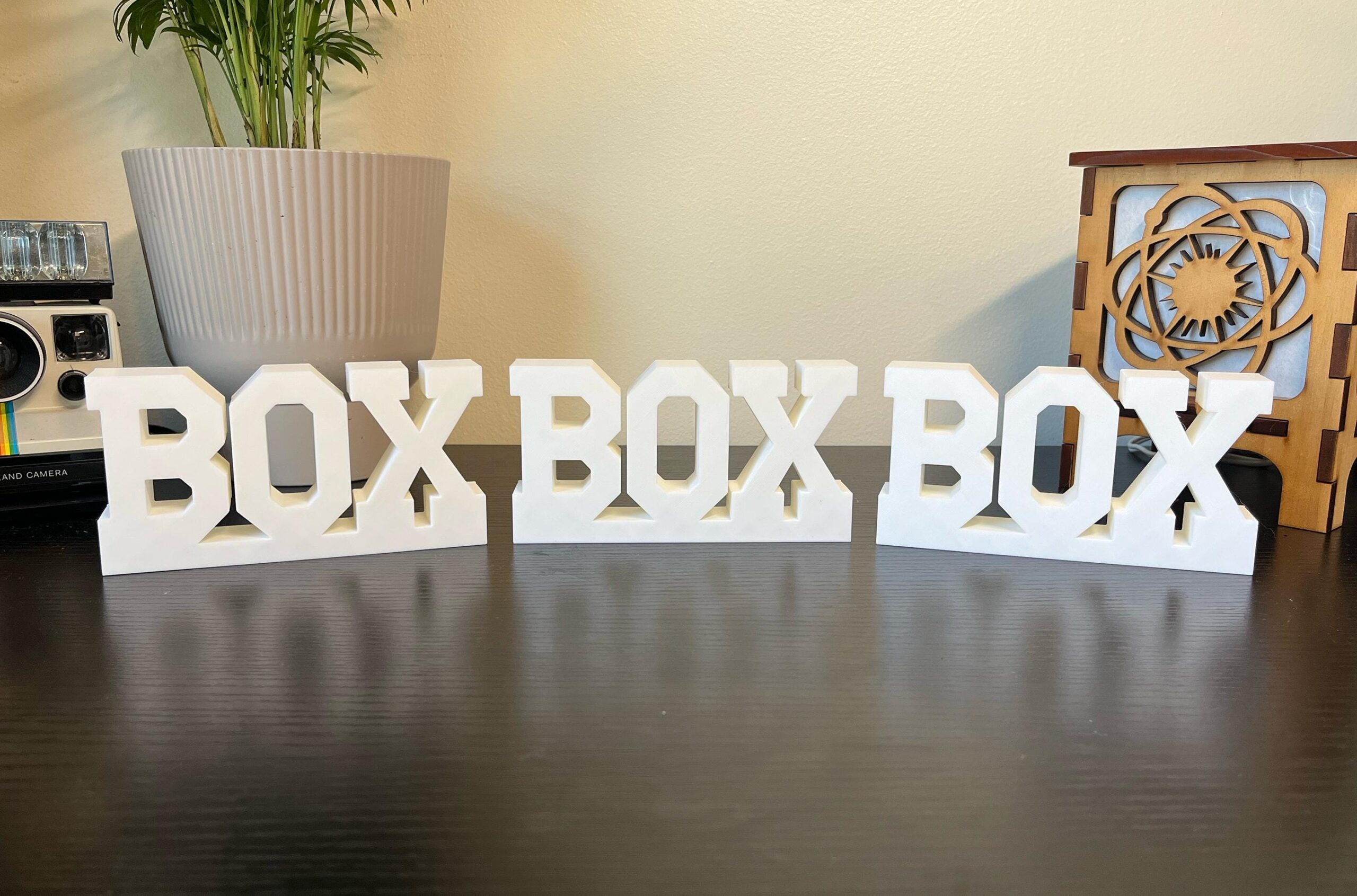 “Box Box Box” text that is 3D printed using PLA filament. Designed and printed in the U.S.A.