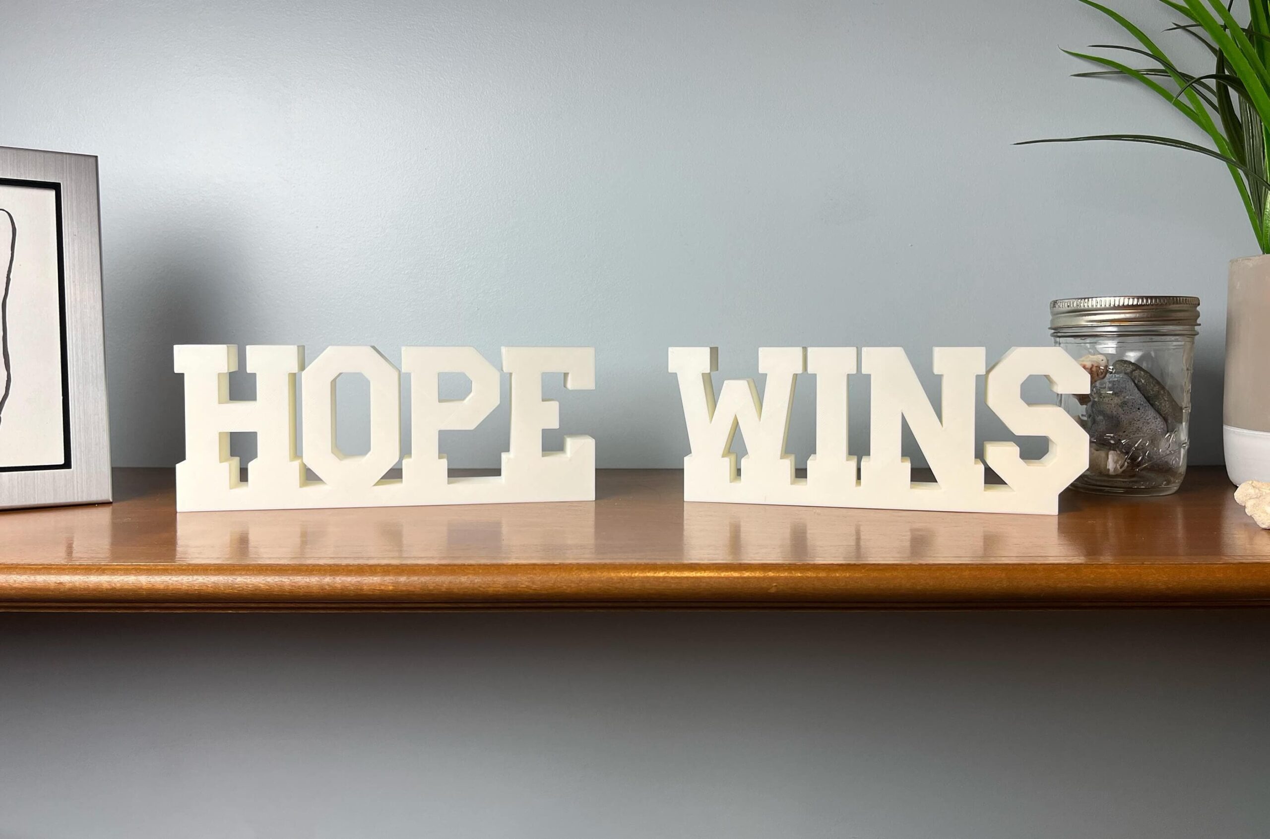 “Hope Wins” text that is 3D printed using PLA filament. Designed and printed in the U.S.A.